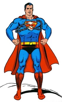 En este tiempo el traje de Superman modificó el tono rojo y azul. En ocasiones se ponía el triángulo con S en la capa y esta letra aumentó su tamaño en el pecho, con toques amarillos. Este modelo es el que más ha predominado en el superhéroe. | |